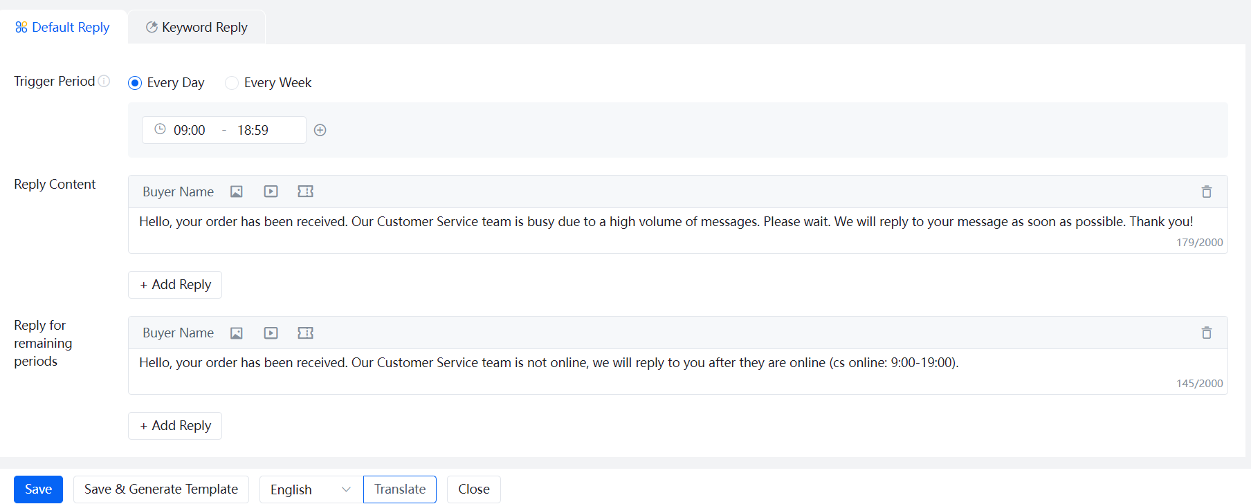 Optimizing your auto-reply strategy is key to boosting your store's response rate and buyer satisfaction. We can set up auto-replies for different scenarios: