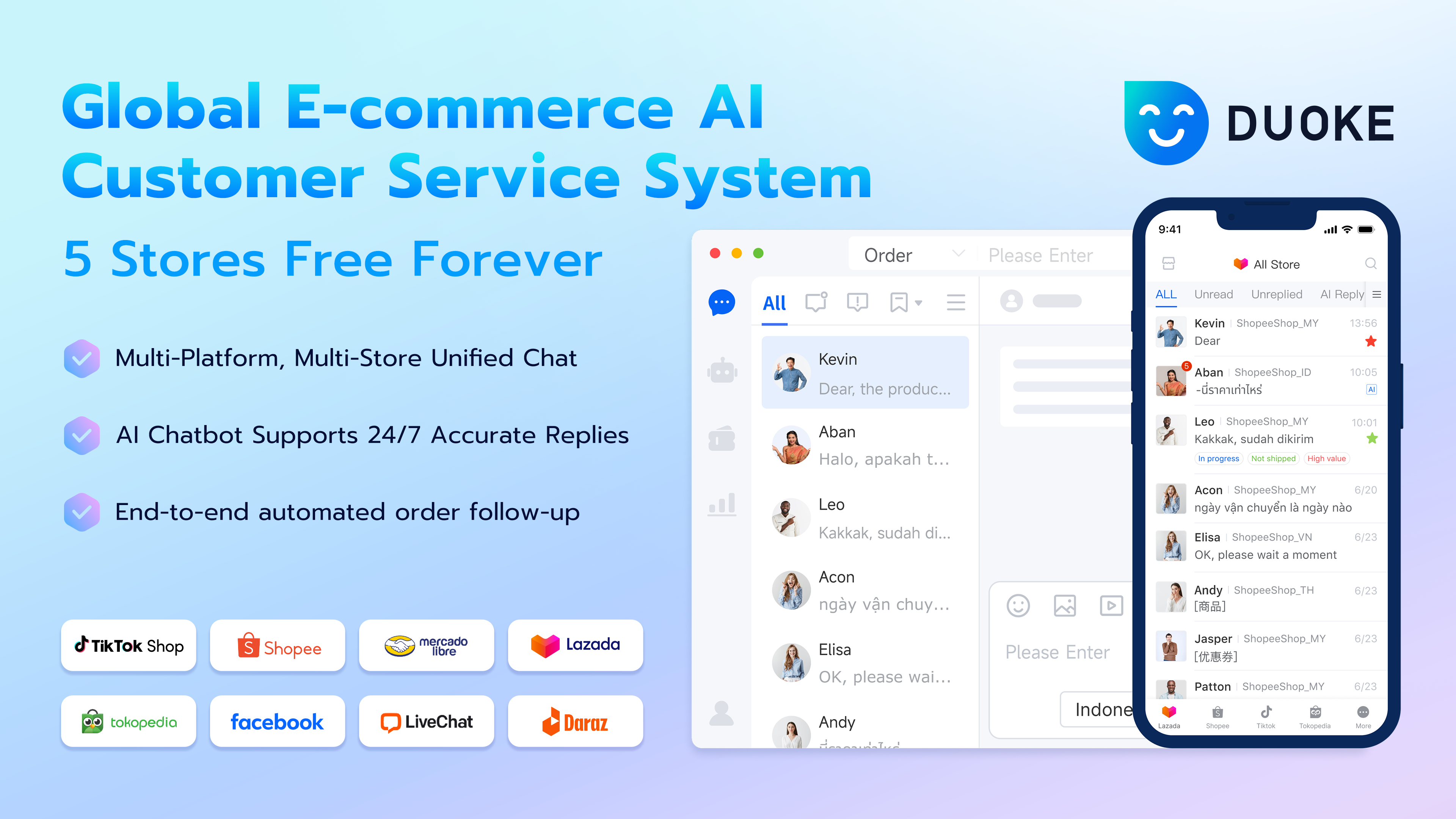 Duoke is an AI intelligent customer service reception tool that integrates customer messages from multiple platforms such as Lazada, Shopee, Tik Tok Shop, Mercado, Facebook, etc.It unifies the management of multiple platforms and multiple stores, and centrally and efficiently processes customer messages.
