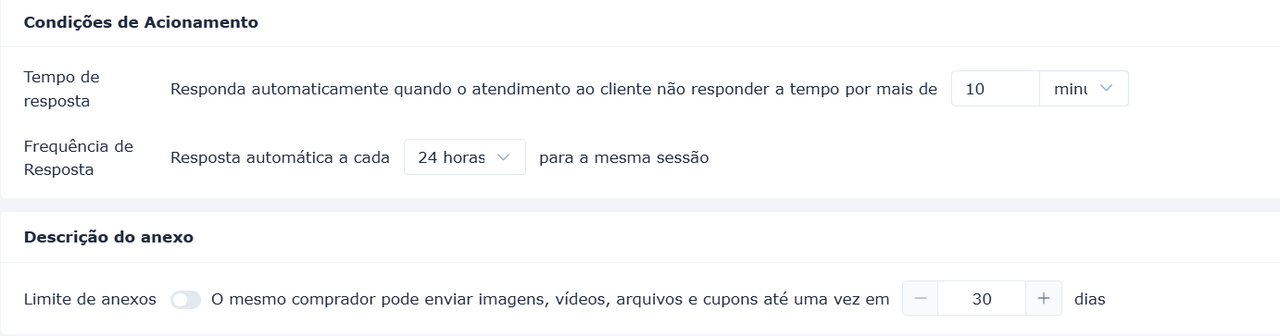 Quando você não responde manualmente e nenhuma outra automação (incluindo resposta por IA ou lembretes do fluxo de pedido) é acionada, o sistema envia uma mensagem pré-configurada dentro do tempo definido.