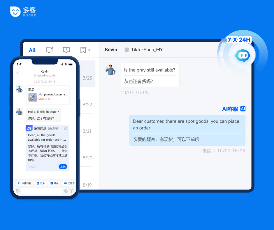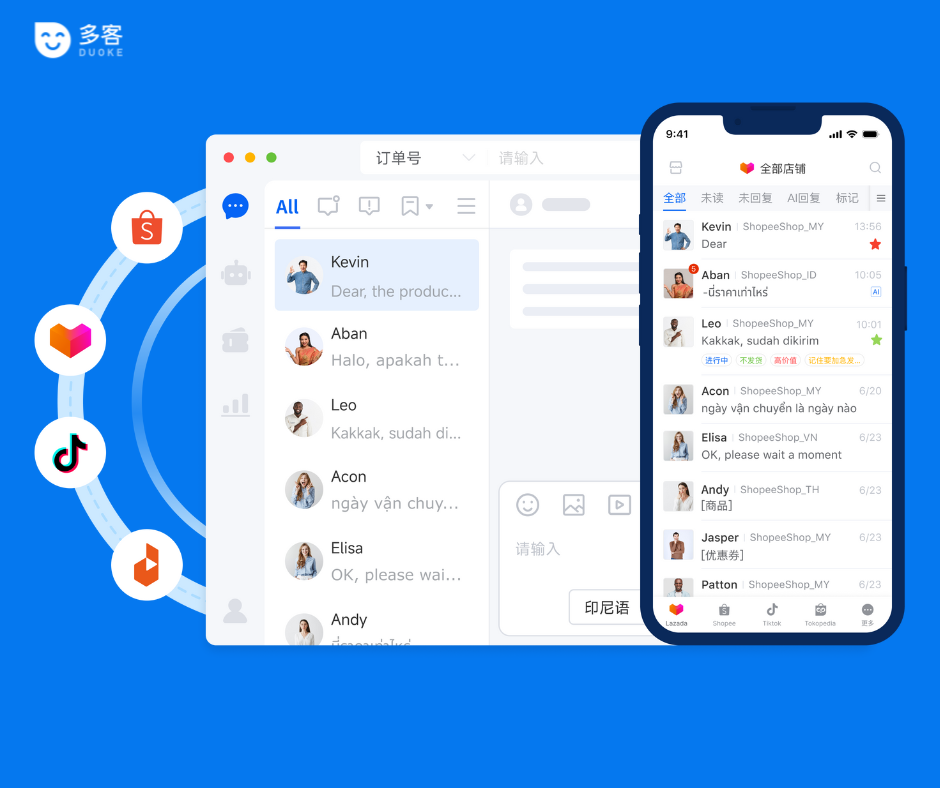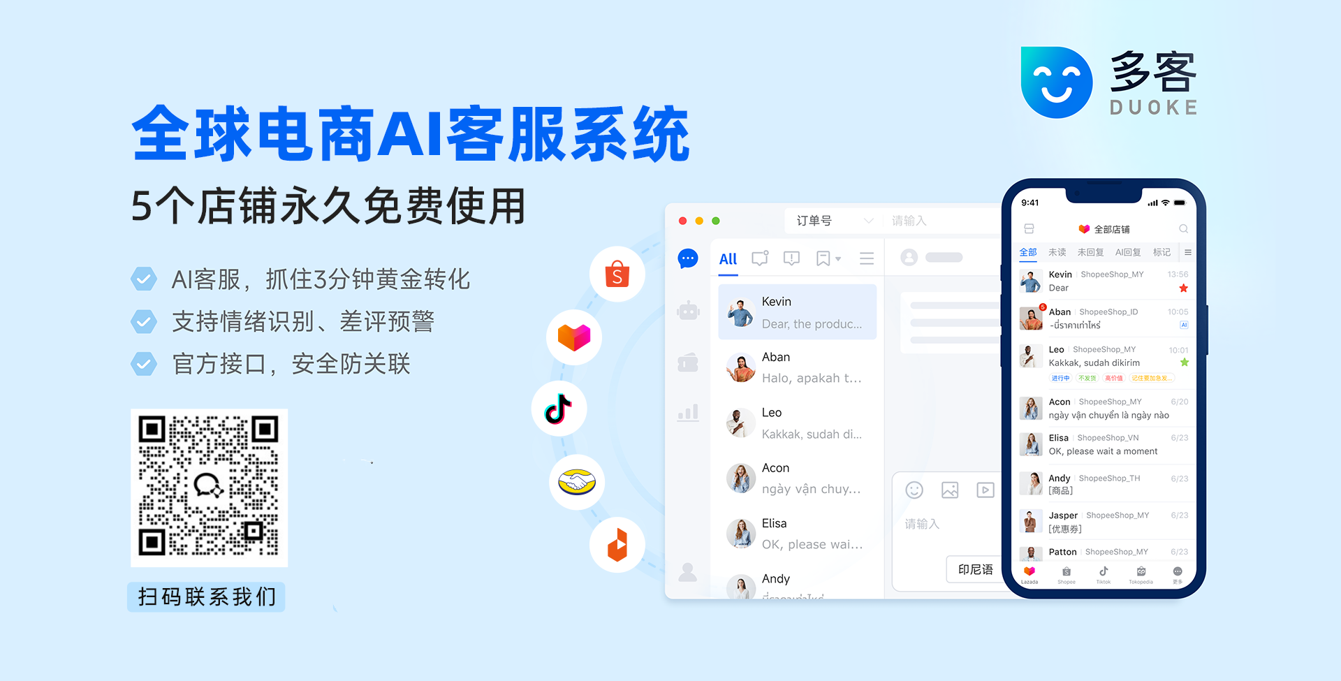 三、解决方案:多客AI客服系统多客(Duoke)是一款专为跨境电商打造的AI智能客服系统,通过集成Shopee、Lazada、TikTok、Tokopedia等主流电商,实现对多店铺、多平台消息的统一接收与管理。系统不仅提供全天候AI客服接待,还能够自动完成多语言实时翻译、订单行为响应、智能催单催付等高频场景任务,显著降低订单取消率与中差评风险,节省70%以上人力成本,全面提升客户转化体验。核心功能亮点:多平台消息统一管理:聚合 Shopee、Lazada、TikTok Shop、Tokopedia 等主流电商平台消息。客服无需频繁切换账号,一站式管理所有客户对话,提升响应效率。