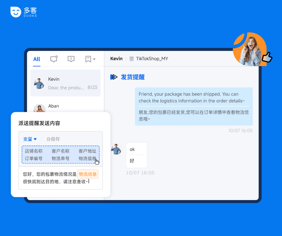 多客(Duoke)是一款专为跨境电商打造的AI智能客服系统,通过集成Shopee、Lazada、TikTok、Tokopedia等主流电商,实现对多店铺、多平台消息的统一接收与管理。系统不仅提供全天候AI客服接待,还能够自动完成多语言实时翻译、订单行为响应、智能催单催付等高频场景任务,显著降低订单取消率与中差评风险,节省70%以上人力成本,全面提升客户转化体验。