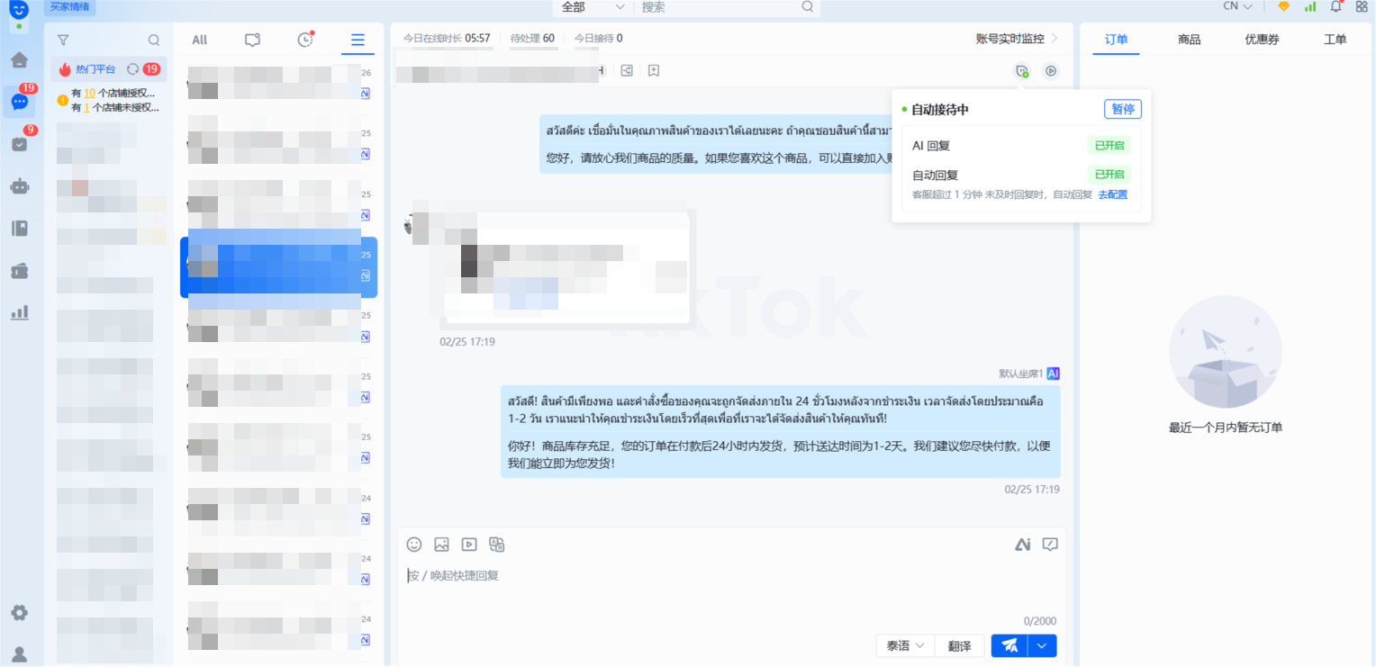 很多东南亚卖家的订单高峰往往出现在夜间或跨时区时段,而人工客服很难实现全天候在线。AI客服可以实现 7×24 小时自动回复,在夜间和咨询高峰期持续响应买家问题,减少因回复延迟导致的订单流失。