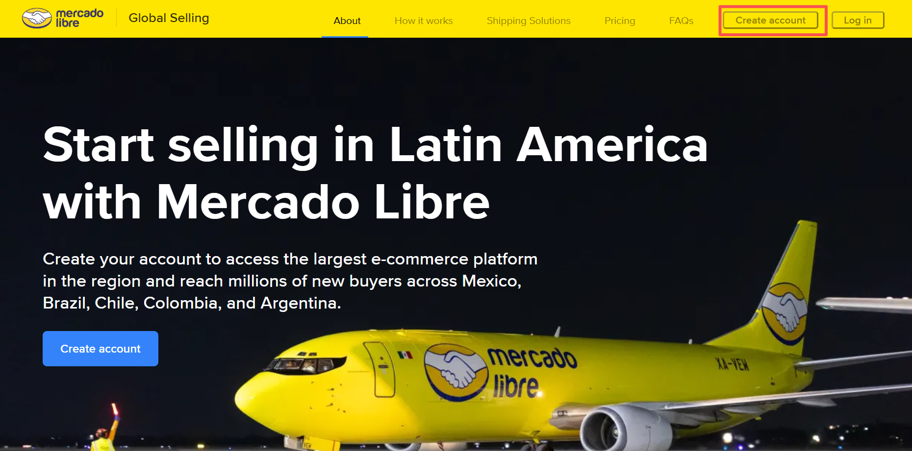 打开美客多全球开店门户网站(电脑端),点击首页导航栏或页面 Banner 中的 “Create Account” 按钮,进入卖家注册通道。
